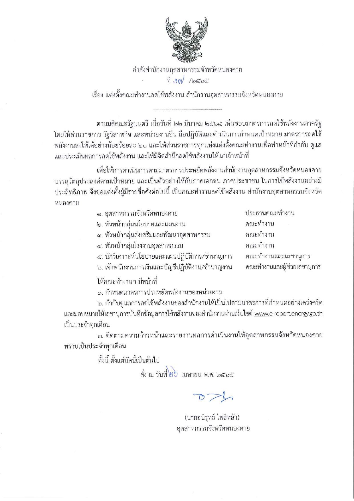 เรื่อง แต่งตั้งคณะทำงานลดใช้พลังงาน สำนักงานอุตสาหกรรมจังหวัดหนองคาย