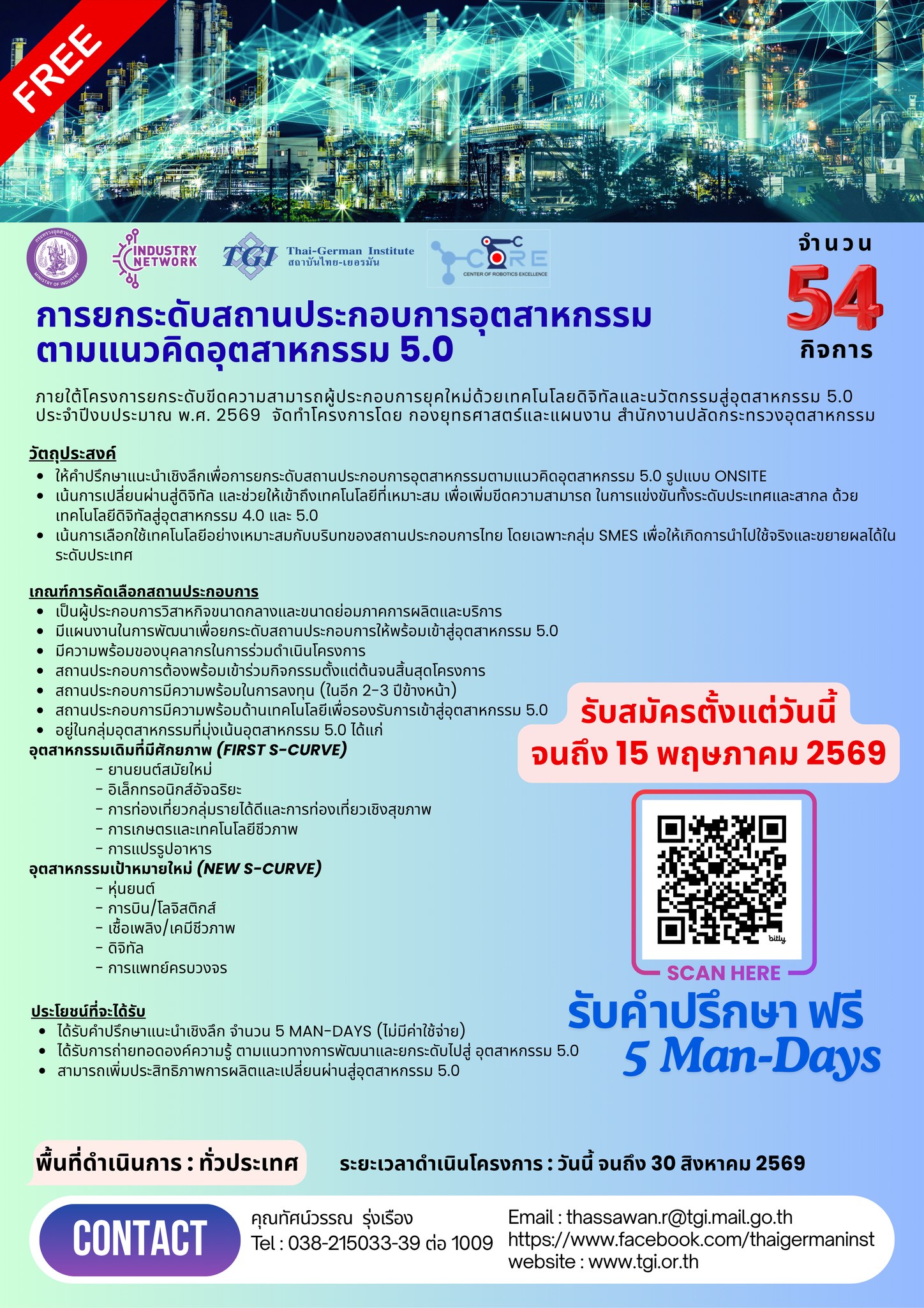 ภายใต้โครงการยกระดับขีดความสามารถผู้ประกอบการยุคใหม่ด้วยเทคโนโลยีดิจิทัลและนวัตกรรมสู่อุตสาหกรรม 5.0 ประจำปีงบประมาณ พ.ศ. 2569 จัดทำโครงการโดย กองยุทธศาสตร์และแผนงาน สำนักงานปลัดกระทรวงอุตสาหกรรม